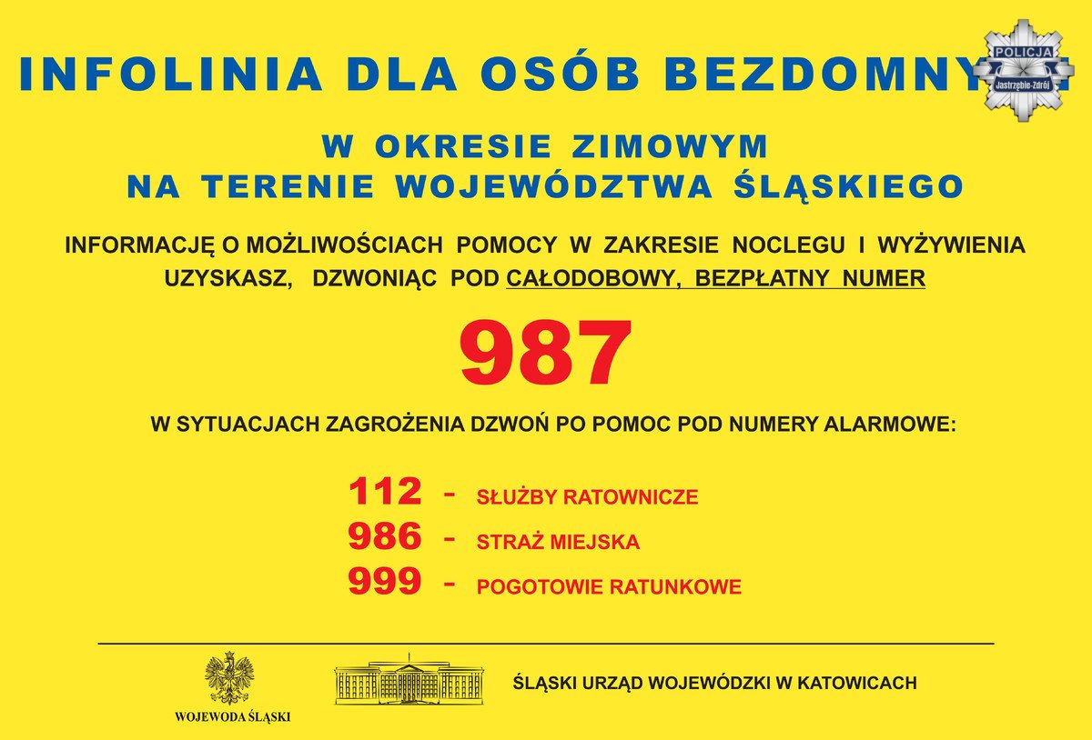 Przypominamy, że co roku, od 1 listopada do 31 marca, działa specjalna, całodobowa infolinia, obejmująca teren całego województwa śląskiego, gdzie pod numerem telefonu 987 można uzyskać informację o możliwości pomocy osobom bezdomnym.