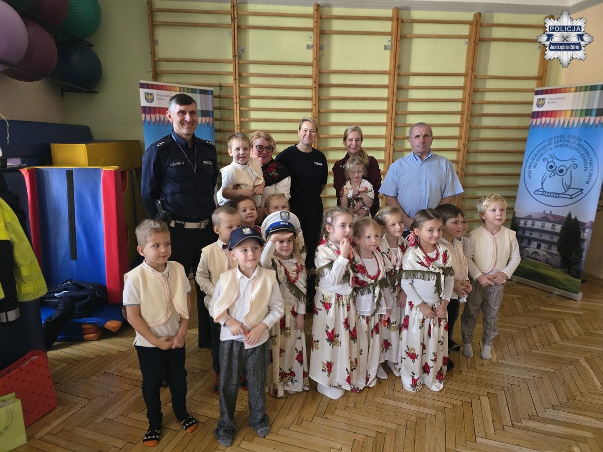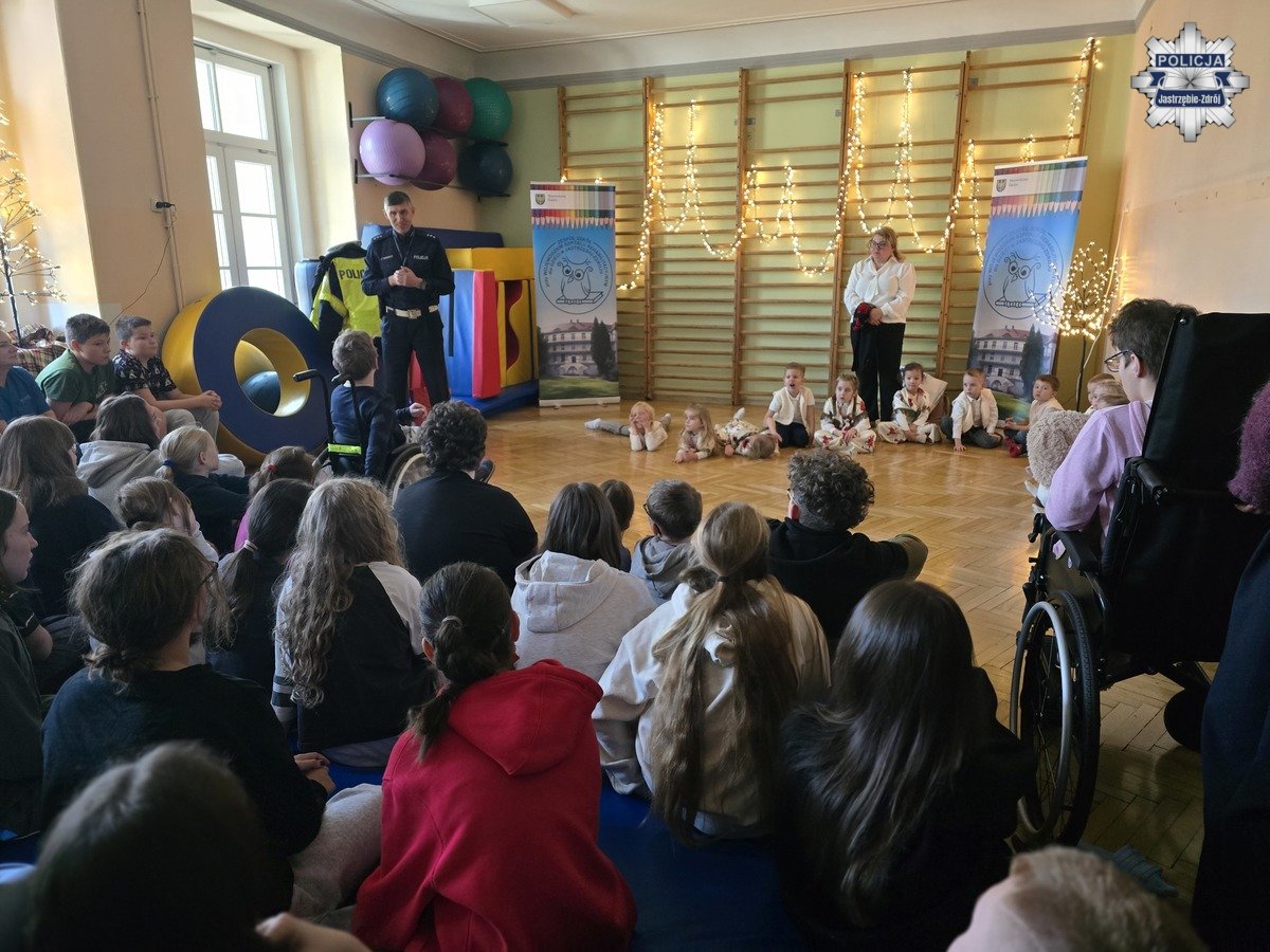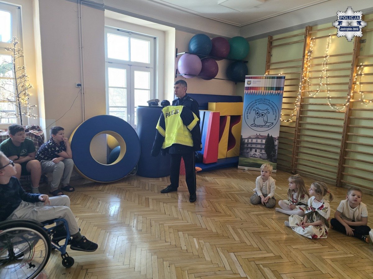 Policjanci z Komendy Miejskiej Policji w Jastrzębiu-Zdroju – nadkomisarz Robert Szablicki oraz aspirant sztabowa Halina Semik wraz z przedszkolakami z Przedszkola Publicznego nr 23 w Jastrzębiu-Zdroju, odwiedzili dzieci z Zespołu Szkół przy Wojewódzkim Szpitalu Rehabilitacyjnym dla dzieci w Jastrzębiu-Zdroju, aby porozmawiać o bezpieczeństwie na drodze. Spotkanie odbyło się w ramach ogólnopolskiej kampanii „Świeć przykładem – noś odblaski”, mającej na celu zwiększenie świadomości dzieci i dorosłych w zakresie widoczności pieszych na drogach.
