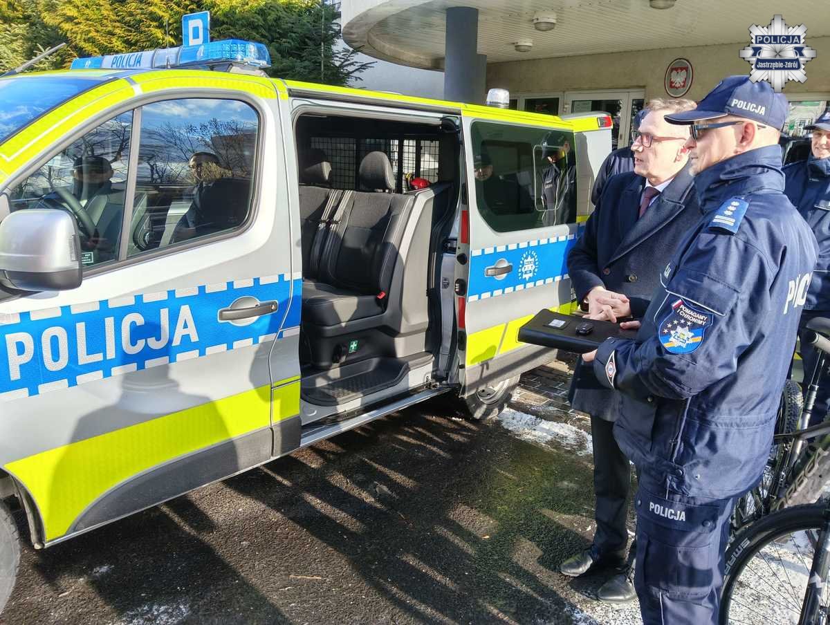 Wczoraj nastąpiło oficjalne przekazanie Komendzie Miejskiej Policji w Jastrzębiu-Zdroju nowego radiowozu marki Renault Trafic oraz dwóch rowerów. To kolejny pojazd z nowoczesną, srebrno-niebieską barwą i fluorescencyjnym oznakowaniem. Pojazd został zakupiony dzięki wspólnemu finansowaniu przez lokalny samorząd oraz Policję. W oficjalnym przekazaniu uczestniczył Komendant Miejski Policji w Jastrzębiu-Zdroju inspektor Grzegorz Bogalski, Prezydent Jastrzębia-Zdroju Michał Urgoł, I Zastępca Komendanta Miejskiego Policji w Jastrzębiu-Zdroju młodszy inspektor Marek Sobiegraj oraz Naczelnik Prewencji komisarz Łukasz Musiał.